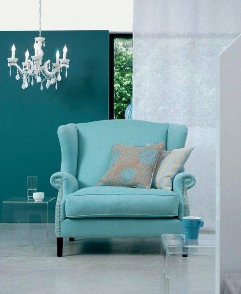 Кресло. Диван, оформленный белым или желтым креслом, приобретает нежный и немного романтичный облик.Также привлекут внимание и не оставят равнодушными, комбинации с изумрудными, салатовыми, мятными или небесно-голубыми креслами и пуфами. Обои. Особенно выгодно модель цвета морской волны будет смотреться на фоне нейтральных бежевых, серых, белых, молочных, жемчужно-серых или серо-голубых обоев. Также достаточно интересно бирюза выглядит, когда на стенах присутствует зелено-желтый, зелено-голубой или желто-голубой принт