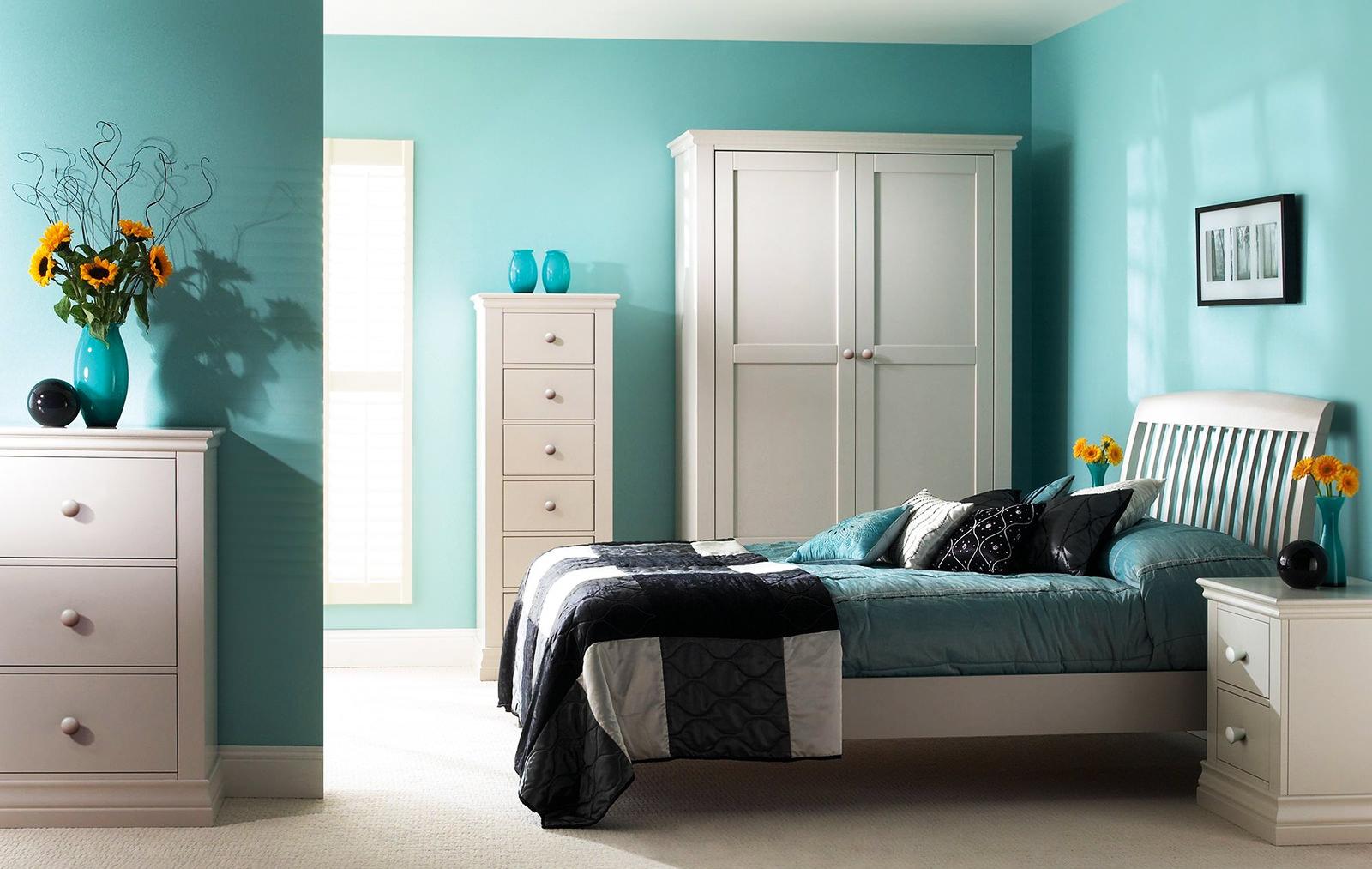 Спальня с нежно-бирюзовыми стенами и белым потолком