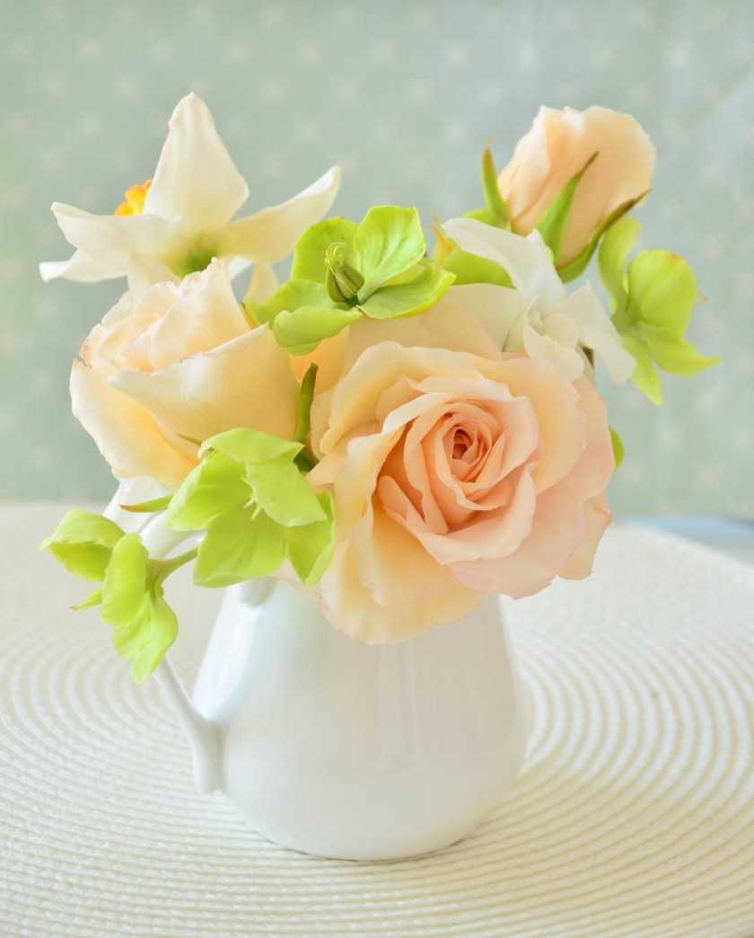 Для более реалистичного цвета цветов кисточкой нанесите сухую пищевую краску, затем подержите над паром от чайника. Фарфор впитает в себя краситель. Наносить его необходимо после того, как цветок уже застыл.