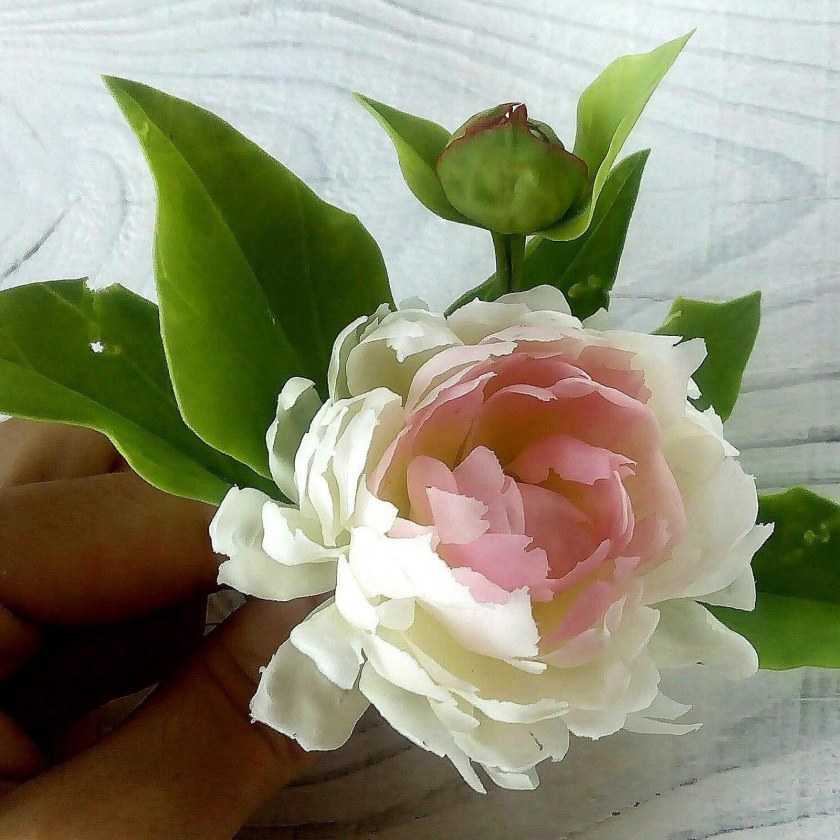 Такие пышные цветы можно изготовить из светло-розовой, бордовой, желтой и белой глины. Если вы создаете цветочную композицию, а не используете пионы для украшений, толстую проволоку, которая выполняет функцию стебля, обмотайте зеленым холодным фарфором и сформируйте 3 листика.