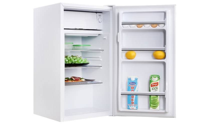 Это простой бюджетный образец белого цвета из пластика и металла с небольшими габаритами (48×60,5×86,5 см). Однокамерный холодильник объёмом всего 88 л с маленьким морозильным отсеком (27 л), отделённым собственной дверцей. В нём температура достигает только -12 °C, так что ждать качественной заморозки продуктов не приходится. Поэтому эту модель выбирают для дачи, общежития, мини-гостиницы и т. д. В холодильнике расположены две стеклянные полки и ящик снизу. Дверь можно перевешивать на другую сторону, как и у остальных моделей. Встроенная ручка облегчает её открытие. Компрессор один, что характерно для всех холодильников в этом разделе. Размораживается морозильная камера вручную, а холодильная — капельным способом. Регулировать температуру охлаждения можно поворотным переключателем. Холодильник достаточно экономичен (класс эффективности — А), расходует 161 кВт×ч в год. Главное достоинство — низкий уровень шума (40 дБ).