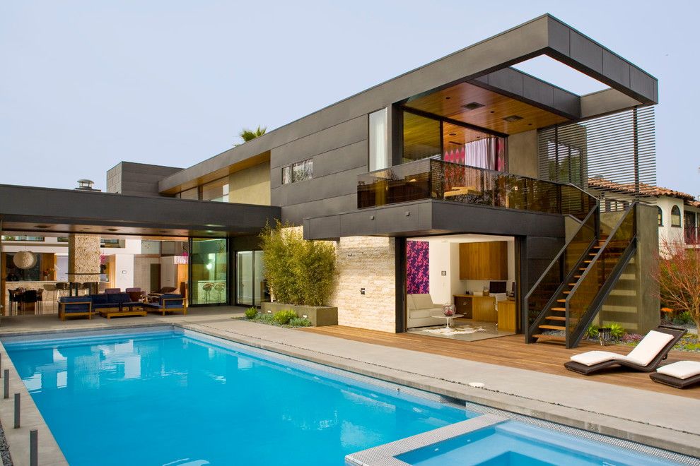 Фасад. Основным модулем постройки служит прямоугольная коробка. Балконы, террасы и различные пристройки нередко имеют нестандартную форму и размеры. Единственное условие — соблюдение лаконичности форм и строгости линий. Нередко на внешних фасадах дома присутствуют инженерные системы.