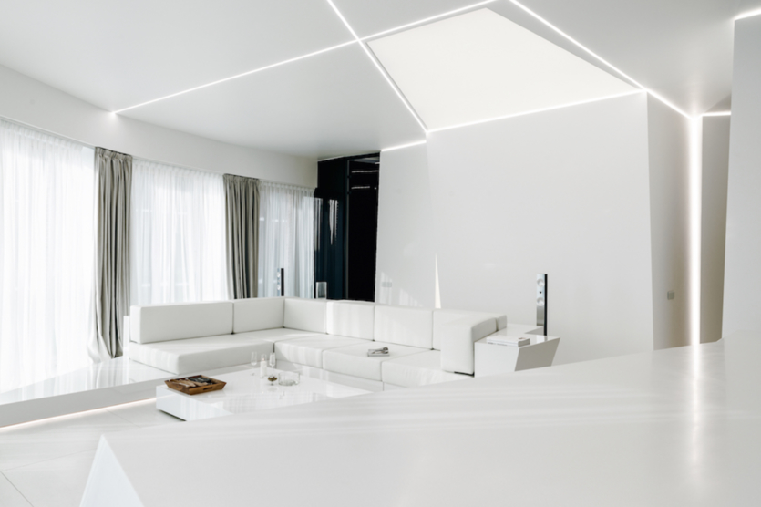 Без разноуровневого освещения и линейной LED-подсветки поверхностей интерьер хай-тек-гостиной не сложится в цельную картину