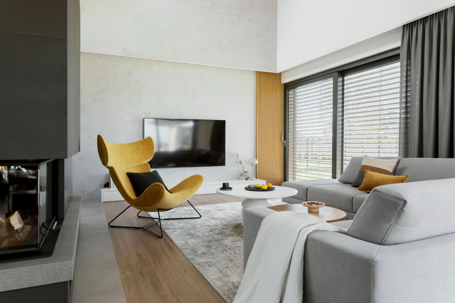 Вместо штор используются жалюзи или нейтральные однотонные ролеты блэкаут. Основная цветовая палитра остается неизменной – это серый, белый и черный. Гладкие натяжные потолки со встроенными светильниками и светодиодной подсветкой дополняют картину.