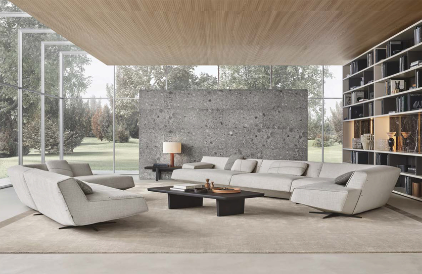 В целом принадлежность к стилистике определяет не мебель, а все-таки планировка, отделка и свет, поэтому нет особенной надобности в том, чтобы искать специфичные диваны, кресла, стеллажи, столики и другие предметы. Выбирайте что-то нейтральное и минималистичное, в духе эстетики брендов Flexform, Poliform, Minotti. Подходящие материалы обивки — кожа, замша, нубук, любая однотонная ткань.