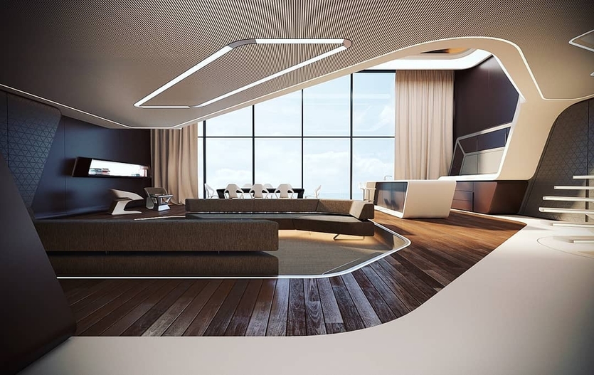 Помимо этого, такой интерьер должен быть оборудован новейшими системами климат-контроля, ароматизации и звука. В общем, все для комфортного отдыха любителей инновационных технологий.