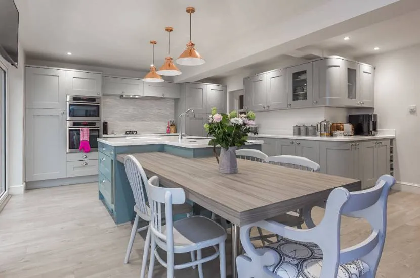 Кухня-столовая в голубом и серомИсточник houzz.se