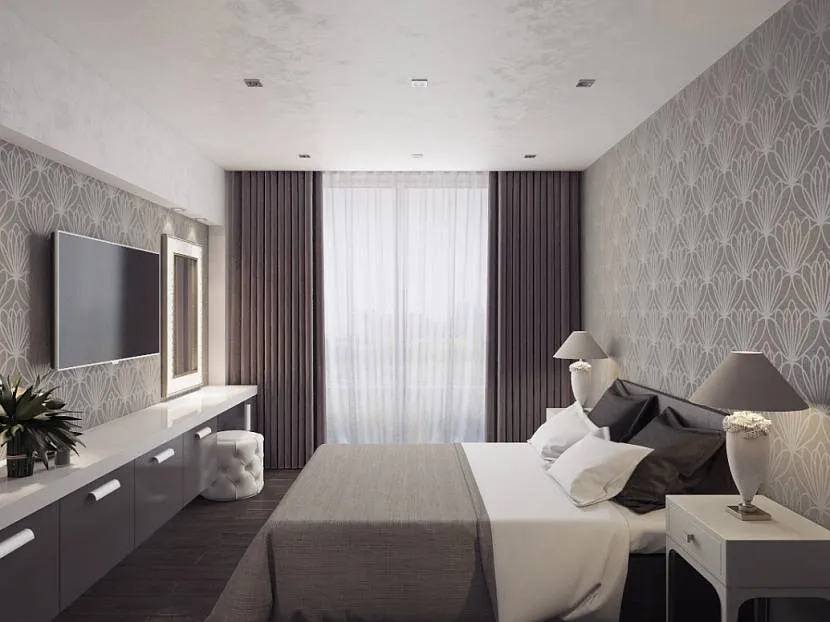 Сероватая расцветка делает помещение спокойным и умиротворенным. Для спальни желательно не выбирать различные оттенки, в ней лучше смотрится 1 или 2 тона серого.