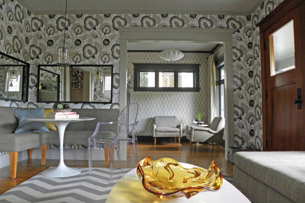 Сочетать обои необязательно по всему периметру комнаты, можно проявить фантазию и скомбинировать их для выделения одной центральной стены, или оклеить все стены серым, а одну – дополнительным цветом для придания глубины или яркого акцента.