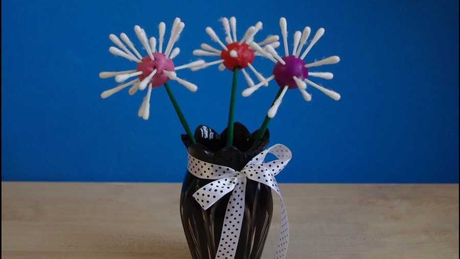 Данная оригинальная идея декора привнесет в любой интерьер уникальности, сделав его индивидуальным. Понадобиться подготовить ватные палочки, для основы шарик из пенопласта, красители пищевого назначения и трубку и или ветку для стебля цветка.