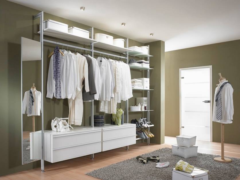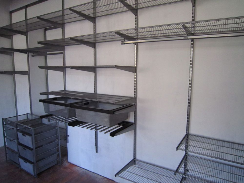 - существуют полностью металлические системы, или комбинированные с другими материалами. Комбинированные гардеробные имеют деревянные или пластиковые полки и ящики. Их легче вписать в определенный интерьер и сочетать с различными дизайнами. Кроме того, наличие закрытых ящиков может облегчить хранение вещей или одежды;