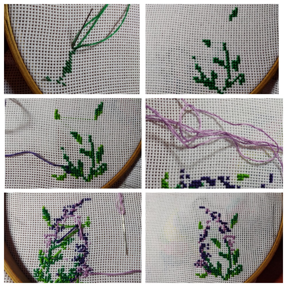 Вместо вышивки каждым цветом по очереди изображение заполняется по рядам, начиная с нижней правой части схемы. Вторая ветка лаванды выполнена сверху вниз. Каждая бисерина пришивается монастырским швом, когда все бусины имеют одинаковый наклон. Учитывая, что схема выбрана с частичной зашивкой, то крепятся только элементы стеблей и цветков лаванды.