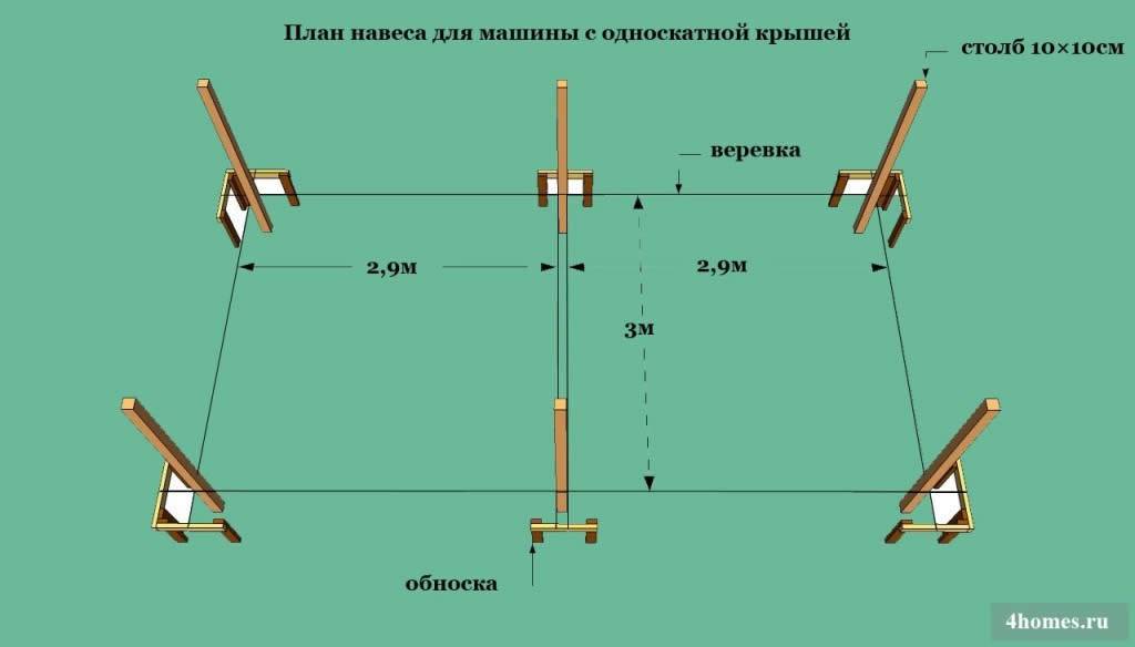 Для этого нам понадобится всего лишь несколько досок для верхней и нижней обвязок, прочные деревянные опоры без сучков, несколько квадратов на стропила, преимущественно 4 штуки. Обрешетку под крышу можно будет сделать из обычной доски шириной 200 мм и толщиной 20 мм. Рассмотрим подробнее чертеж, по которому мы строим навес своими руками.