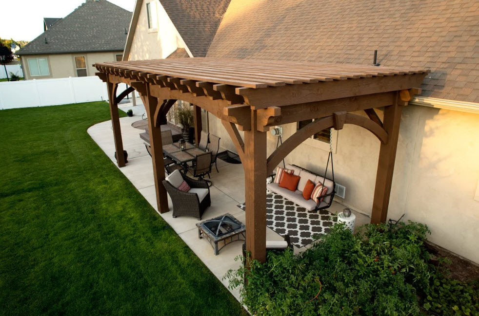 Что касается навесов из дерева, некоторые думают, что это простые, невзрачные сооружения. Но все будет зависеть от воображения, желания обывателя правильно составить проект. Можно орнаментировать конструкции филигранной резьбой, балясинами и красивыми резными элементами. При этом учесть образ сада, где разместится навес, рядом с домом или отдельно.