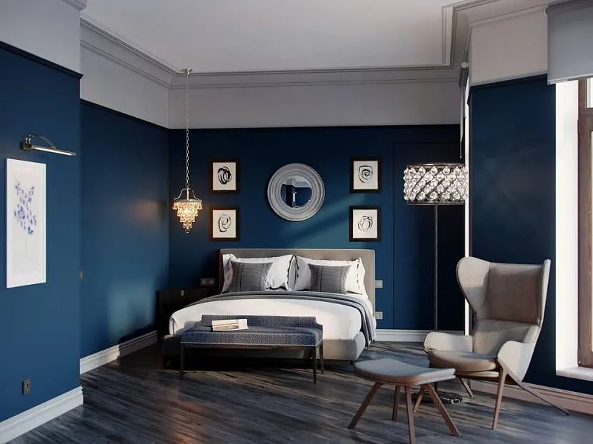 Стандартным вариантом применения синего в интерьере является отделка стен. Этот цвет делает просторные помещения уютней. Маленькой спальне тёмная акцентная стена придает глубины, расширяя или сужая комнату – всё зависит от площади применения. Для оформления используются обои, краска, декоративная штукатурка или деревянные панели.