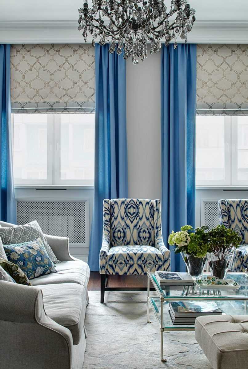 Шторы в гостиную выполняются полностью синими либо с полосами, замысловатыми орнаментами, градиентными переливами. В сочетании с нежно-голубым тюлем, даже темная, оконная драпировка выглядит «летящей», так как создается контраст оттенков и фактур ткани.