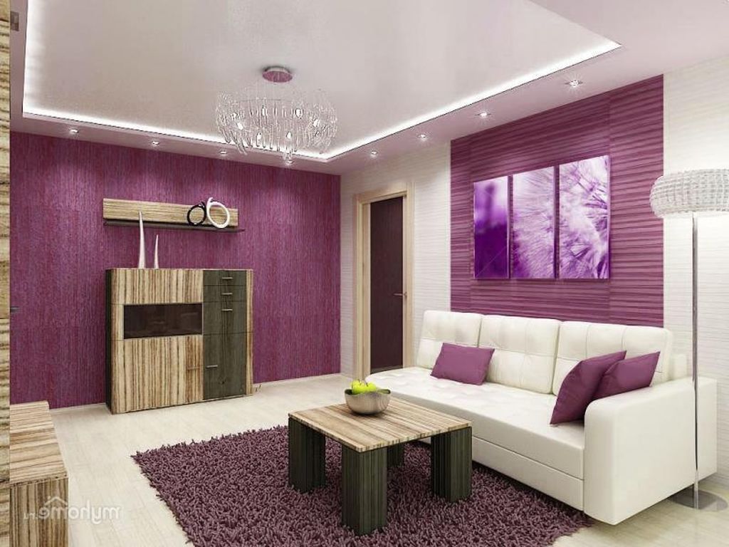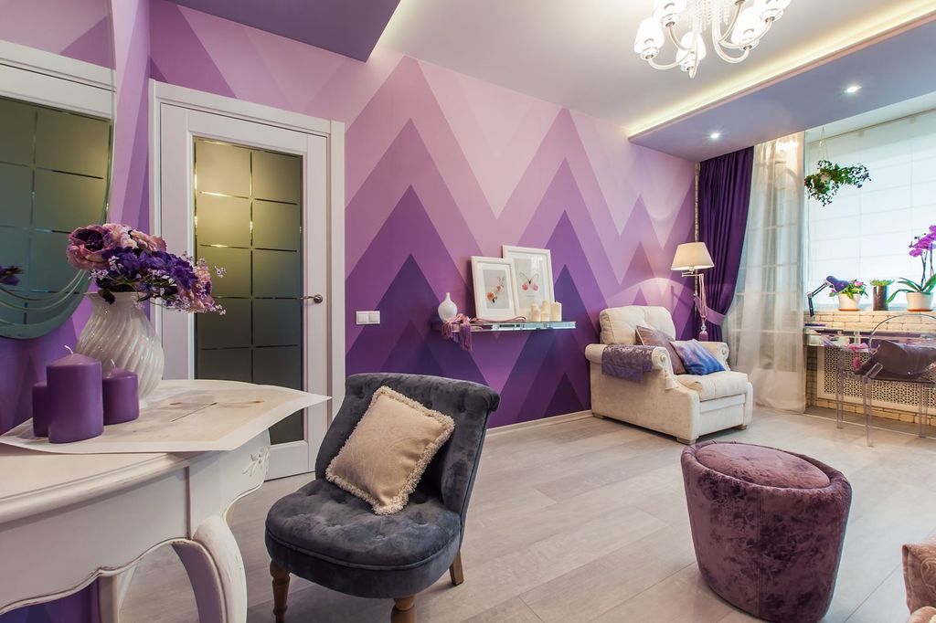 Сиреневый в интерьере гостиной выглядит привлекательно