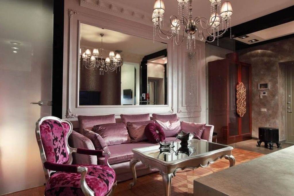В гостиных фиолетовый используется фрагментарно. Однако, оформление в стилях барокко, рококо, современный неоклассицизм приобретает дополнительное грациозное декорирование. Фото фиолетового цвета в интерьере показывают, как можно впечатлить гостей, создать комфорт владельцам. Перечень приемлемых аксессуаров: