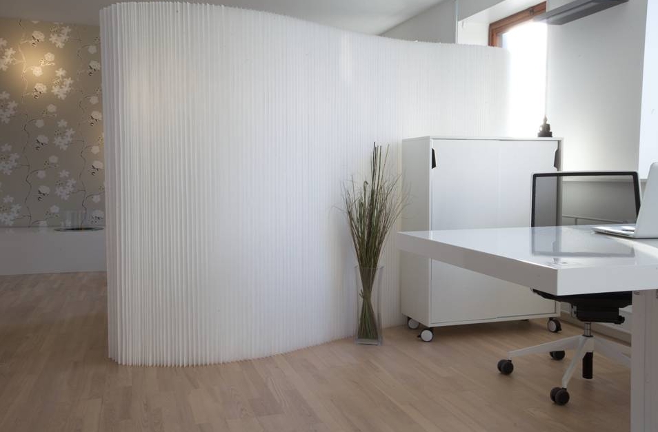 Гибкие перегородки стильно вписываются в интерьер, могут быть выполнены в различных конфигурациях. Чаще всего они выполнены в белом цвете, поэтому модели выглядят легкими и изящными. Для каркаса используются тонкие трубы, рейки или пластины, с помощью которых перегородка также может иметь волнообразную форму. При необходимости гибкую модель сворачивают в трубку и кладут в кладовку.