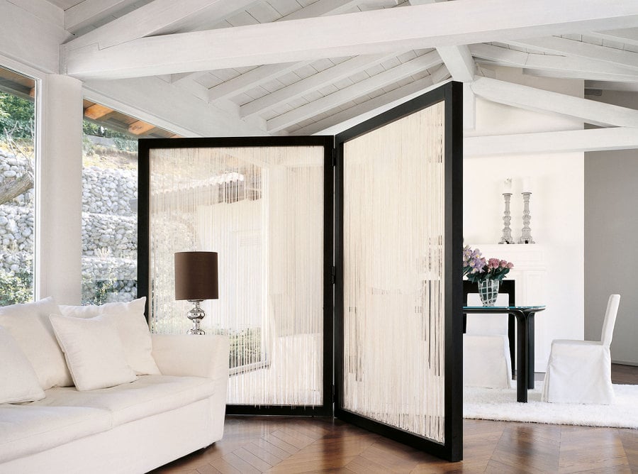 Их еще называют складными, обычно у них 3 дверцы, которые соединены между собой гармошкой. Ширина каждого элемента составляет около 50 см, высота не превышает 180 см. Деревянные ширмы часто используются для выделения определенной зоны в гостиной. Перегородка подвижная, в сложенном виде не занимает много места, поэтому отлично подойдет для небольшой квартиры. Складные модели чаще всего изготавливают из дерева, пластика, реже встречаются стеклянные конструкции.