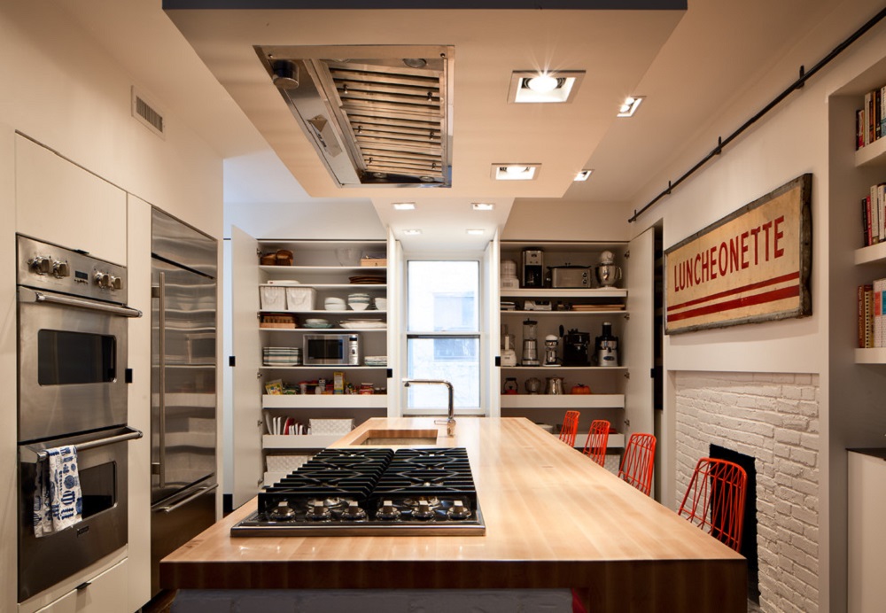 Для лофта, кантри или классики будет полезна отдельностоящая вытяжка. Она будет просматриваться с любой точки комнаты. В современном стиле особенно хорошо будет смотреться встроенная вытяжка. Кроме того, при установке вытяжки будут миниатюрные полки для всяких мелочей.