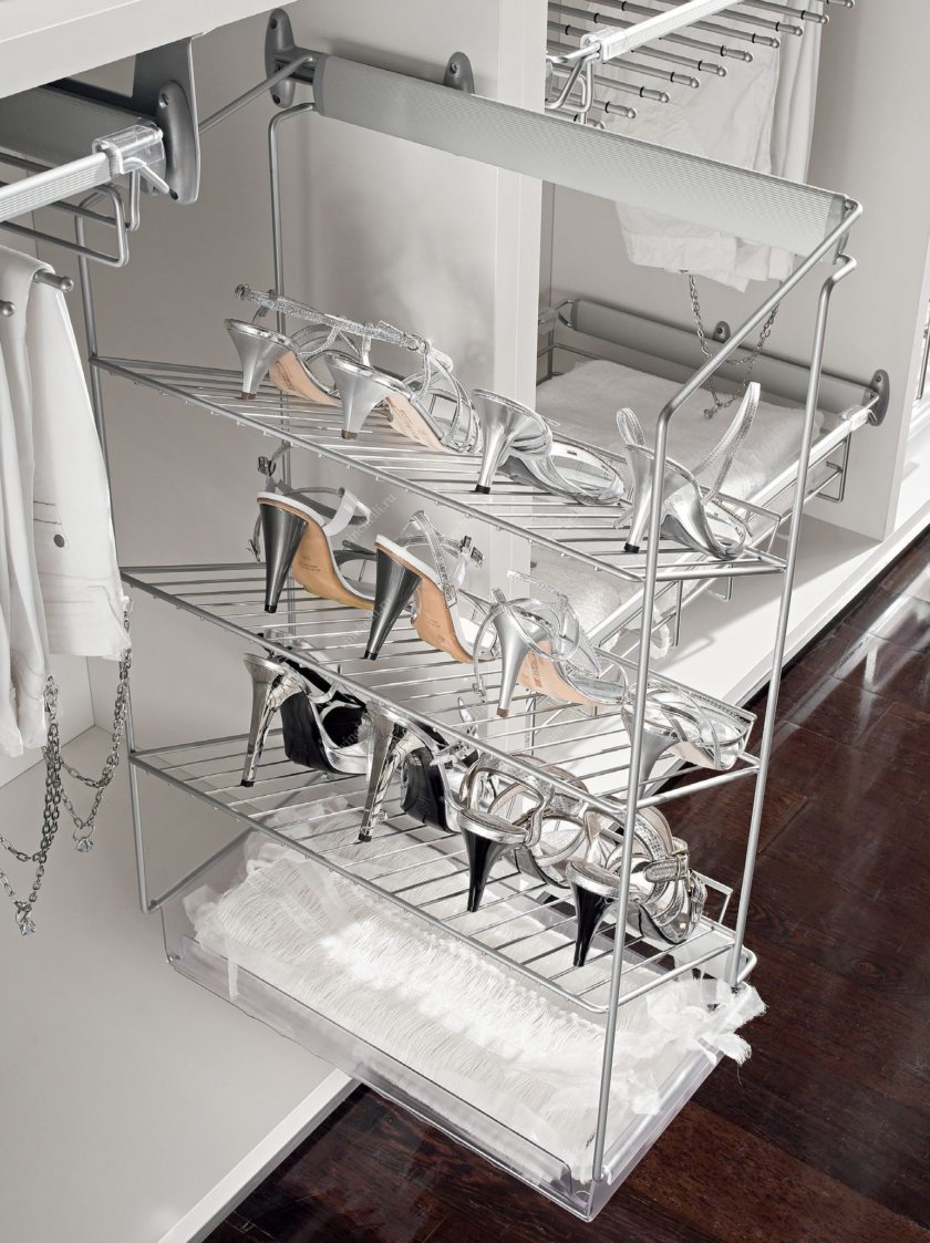 - помогает хранить сумки, аксессуары и предметы ухода за обувью, например, в небольших выдвижных ящиках или на открытых верхних полках;