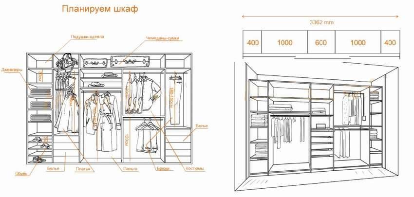 Когда вы делаете шкаф купе своими руками, то должны сами распланировать организацию хранения вещей исходя из размеров конструкции.