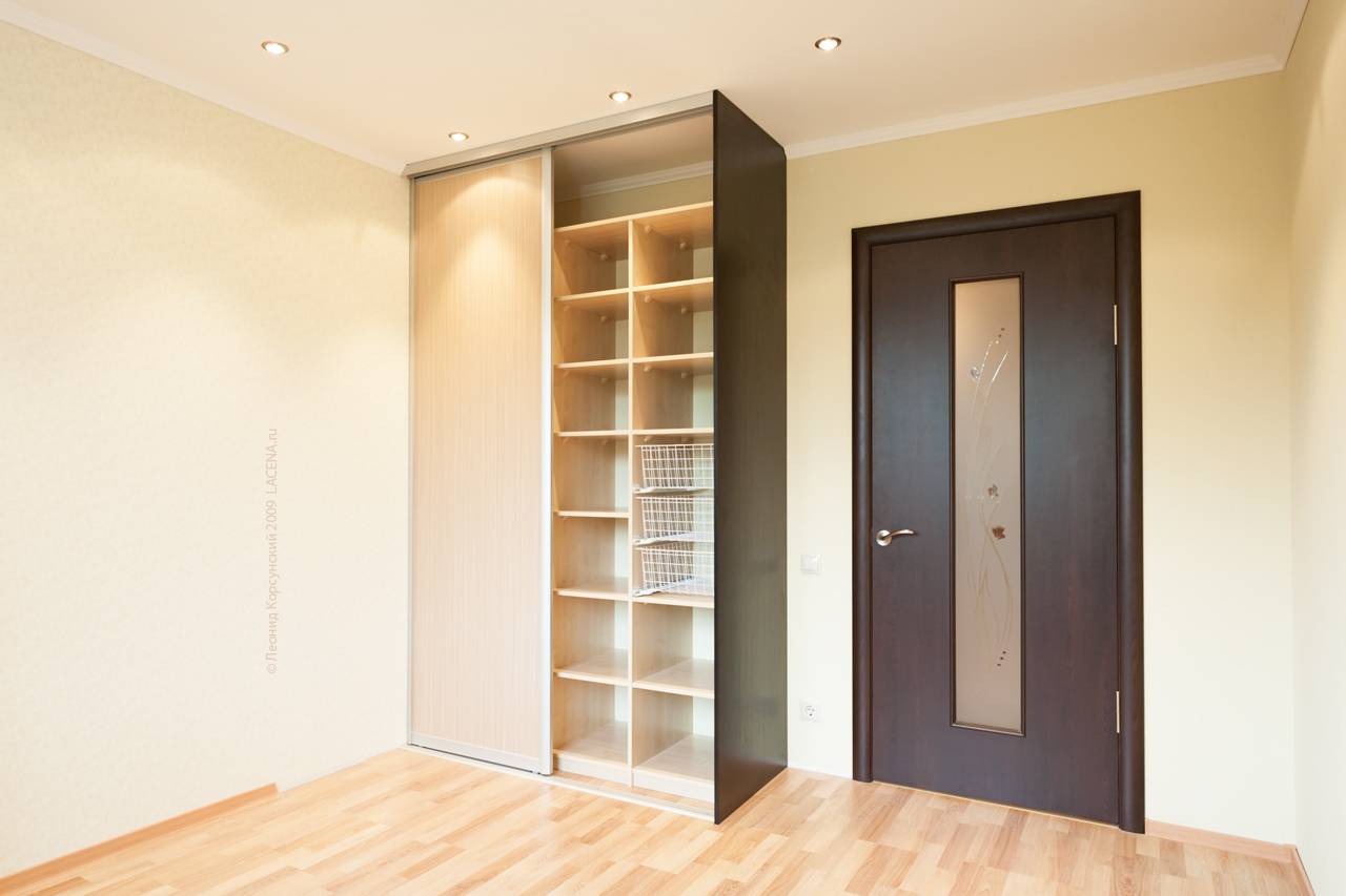 Также часто делают шкаф рядом с входом. В таком случае, не стоит забывать о ширине наличника двери, а так же о возможных выключателях и розетках, которые тоже любят размещать рядом с входом, все это, повлияет на итоговую глубину, либо длину шкафа-купе.