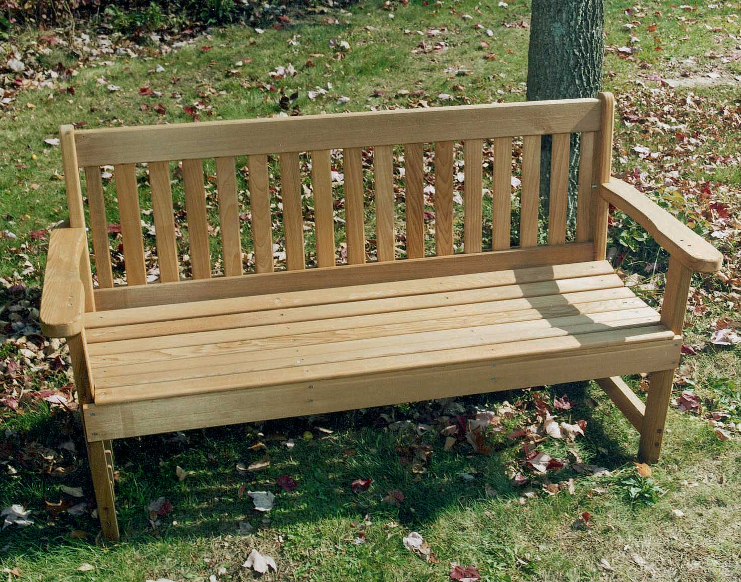 Основание сделано в виде прямоугольного ящика. Спинка также простая с прямой формой. На сиденье положены мягкие подушки, обеспечивающие дополнительный комфорт. - Деревянная скамейка, расположенная вокруг дерева.