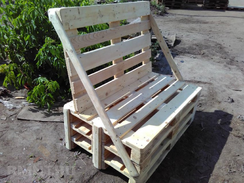 В принципе, стандартная ширина евро поддона несколько велика для сиденья — 80 см. Можно его укоротить до 67 см, обрезав по контуру центрального бруска. Но можно этого и не делать. Вот несколько примеров простых конструкций с разными вариантами оснований и сидений:
