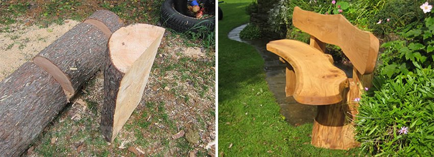 В этом примере скамья уже более комфортабельная — в ней помимо сиденья есть и спинка. Модель чуть сложнее, так как придется найти более высокую часть ствола и обработать его в два приема — вначале сделать профильный распил «уступом», а затем заготовку распустить на две половины.