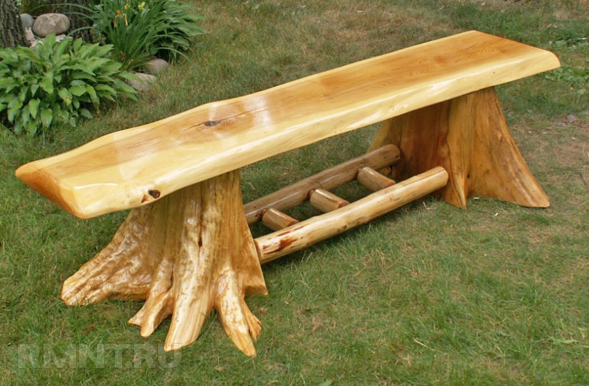 Аккуратно срезав пару средних по размеру пней, их можно пустить на основание скамейки. Из жердей сделать нижнюю перекладину для жесткости конструкции. А для сидения распустить на циркулярке часть ствола. Если нет оборудования для продольной распиловки, то можно взять необрезную доску толщиной 75 мм.