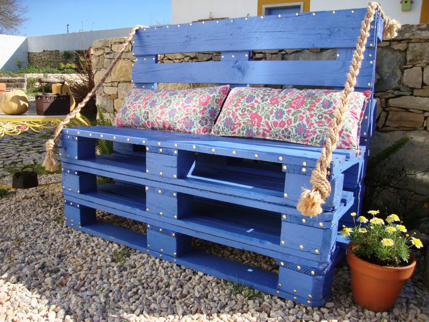 2. В этом случае также используются четыре паллеты, но уже обрезанные. Для фиксации спинки применяют три веревки, сплетенные косой, а для декорирования — обойные гвозди.