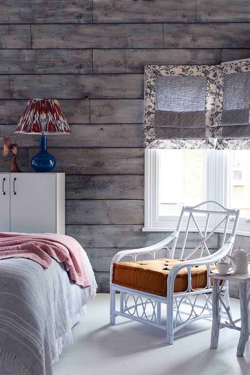 Существует эффективный способ отделки, при котором одну из стен делают акцентной. Ее обшивают вагонкой и красят в общий тон с остальными стенами, потолком и прочими плоскостями. В результате возникает стена с рельефной поверхностью, весьма выразительно передающая специфику стиля, но не слишком выделяющаяся на общем фоне.