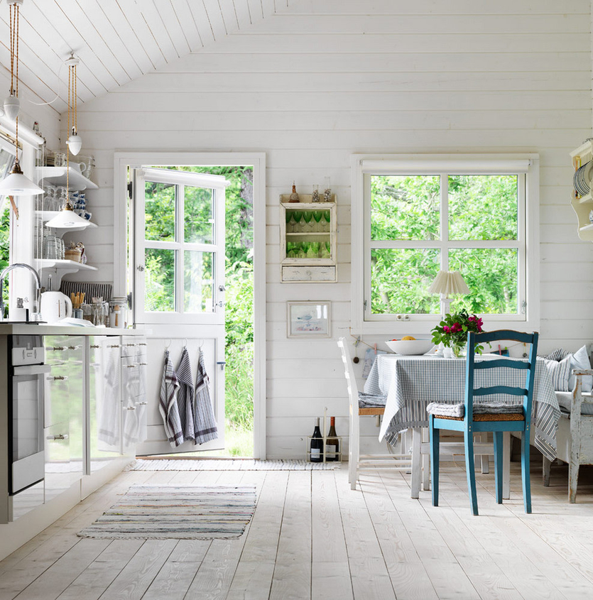 Что касается цветовой схемы, то она должна быть максимально естественной. Желтый, зеленый, розовый и синий, расцветки весенних цветов будут работать отлично. Естественный оттенок дерева идеально сочетается в данном стиле. Вышитые и вязаные изделия приветствуются, а также узоры, как, например, клетка, полоски, горошек и цветы.