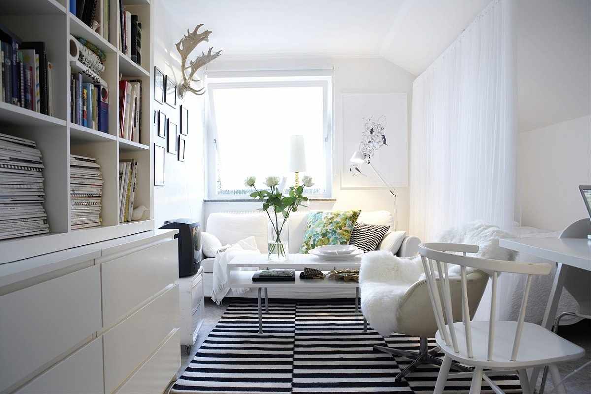 В очень маленькой квартире-студии или однокомнатном жилище стиль скандинавов придётся как нельзя кстати. За счёт того, что используется много белого цвета в отделке стен и потолка, даже пола, квартира кажется намного больше. Мебель здесь присутствует в минимальном количестве, зато она многофункциональная. Диван здесь может использоваться и как полноценное спальное место, обеденный стол трансформируется в рабочее место. Шкаф-купе не займёт много места.