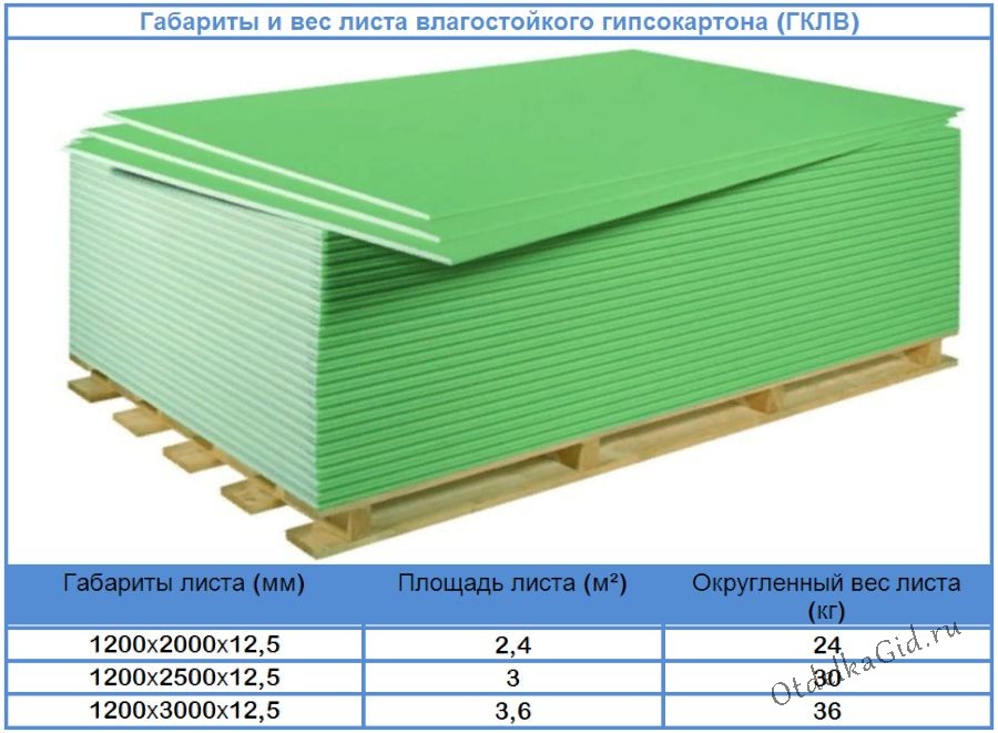 - ГКЛВО — листы обладают показателями повышенной влагостойкости и огнестойкости. Сами листы зелёного цвета с красной маркировкой.