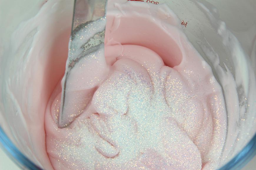 На первом этапе нужно залить в емкость клея, потом гель и тщательно перемешать. Получив однородную массу, засыпаем блестки и сверху боракс. Тетраборат нужно лить по мере размешивания. Как только загустеет, разминаем в руках.