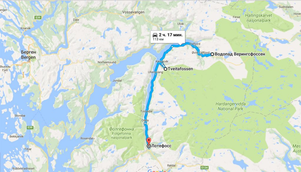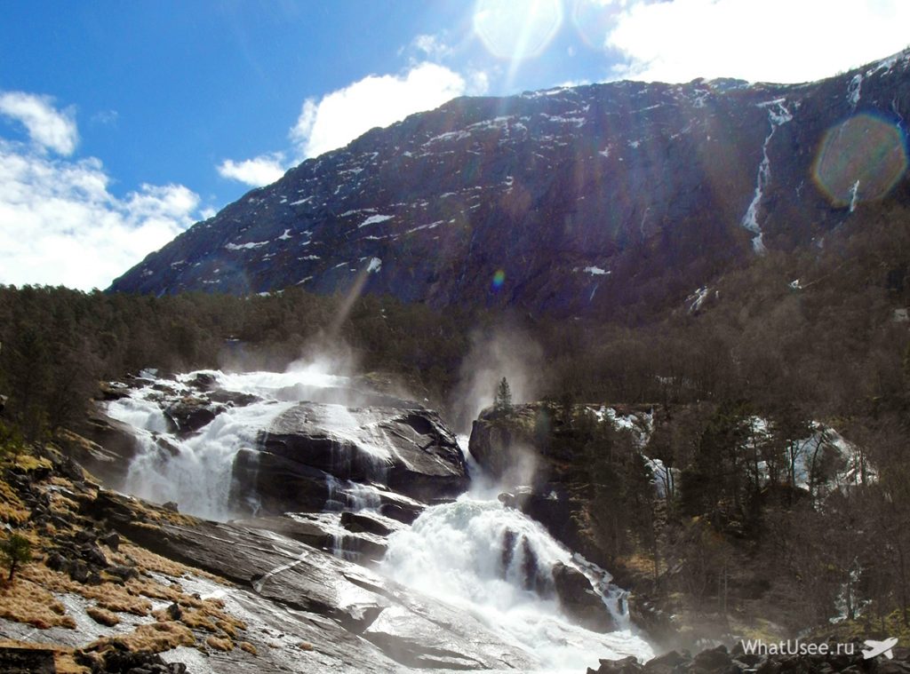 Норвегия — это не только горы. Страна фьордов может похвастаться настоящим царством водопадов, горных рек и всевозможных ручьёв. Особенно много в Норвегии красивейших водопадов. Существует автомобильный туристический маршрут, который так и называется — Дорога водопадов. Так называют отрезок дороги RV13, ведущий с севера от Кинсарвика (Kinsarvik) через городок Одда (Odda) на юг через озеро Suldalsvatnet. Наш маршрут по водопадам Норвегии выглядел так: