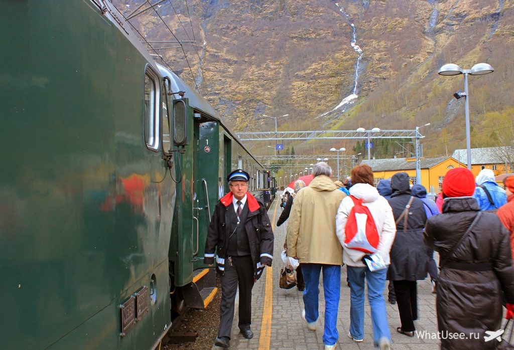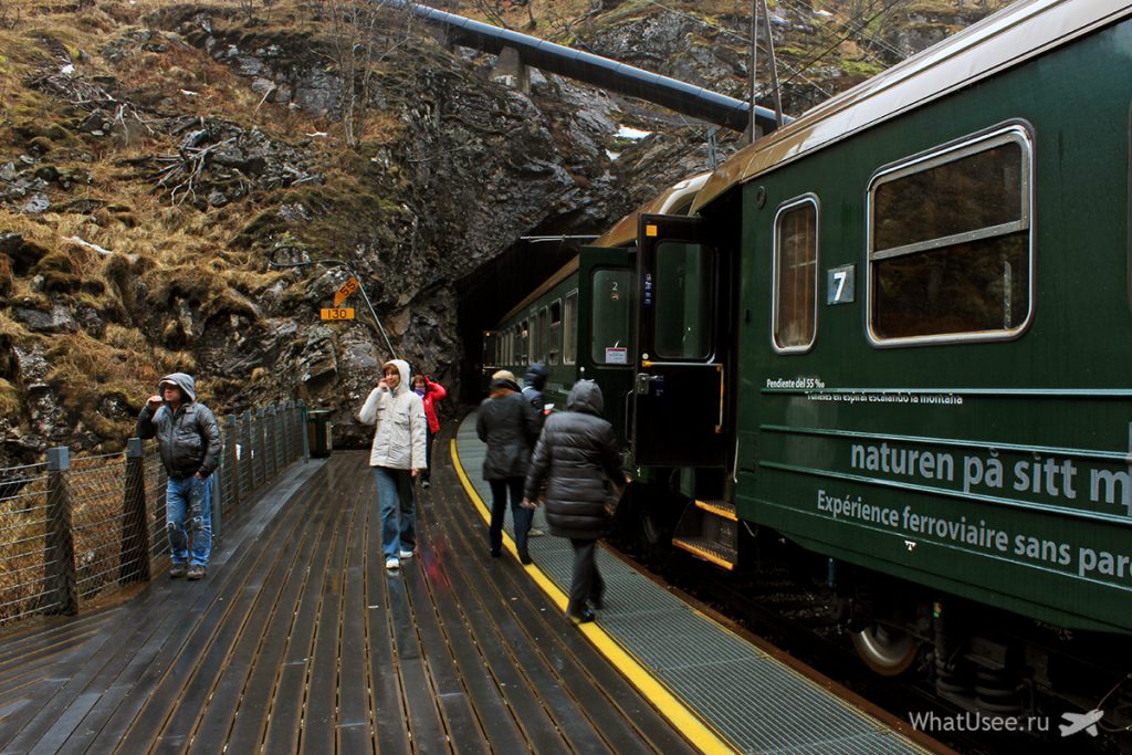 Стоянка поезда на Фломской железной дороге и водопад Kjosfossen: