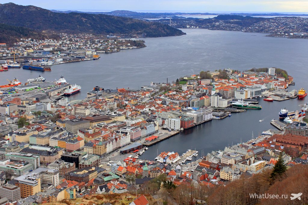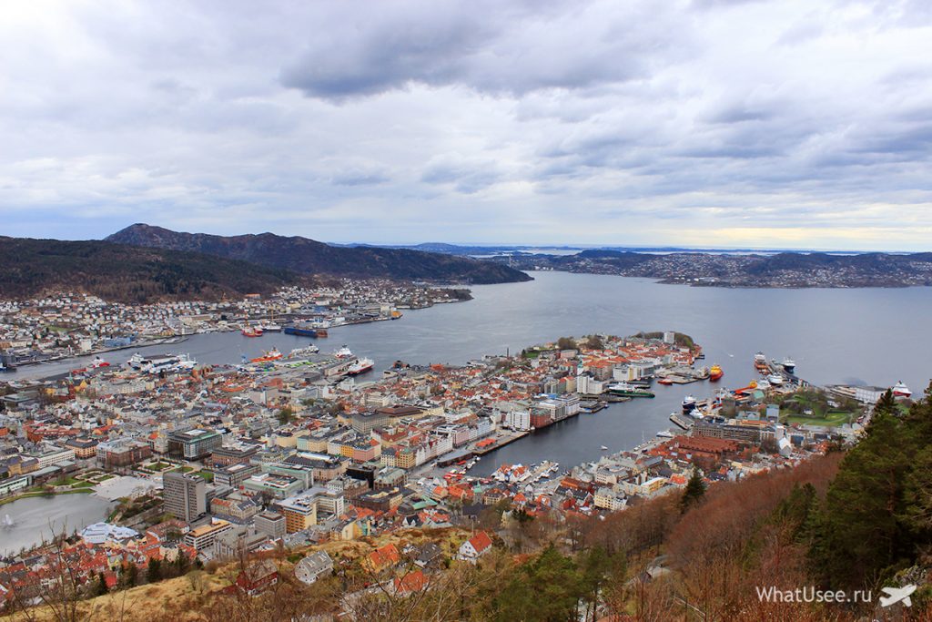 Берген уютно устроился на фьорде, среди гор. Желающие оценить его красоту сверху могут подняться на фуникулёре Fløibanen на смотровую площадку над Бергеном.