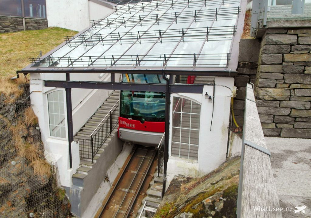 Фуникулёр в Бергене — одна из главных достопримечательностей города и его символ.Можно выйти на промежуточной станции и прогуляться на вершину горы Флёйен по одной из прогулочных троп.