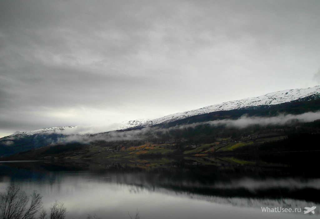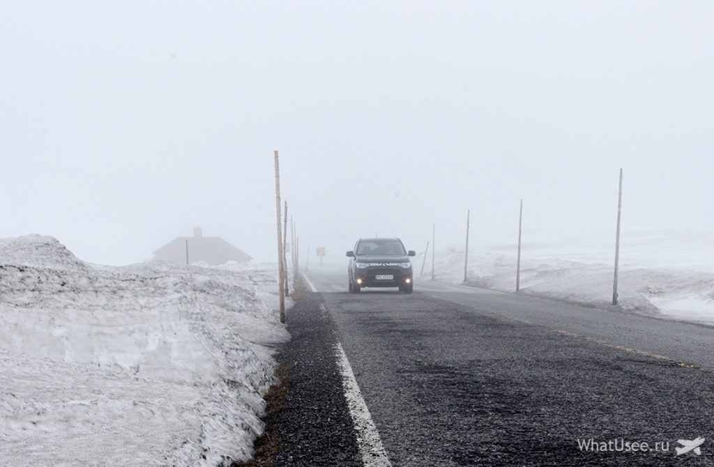 Вот такая она, Норвегия — туманная, фьордистая, загадочная. Примерно так я себе Норвегию и представляла. Из Осло на норвежские фьорды проще всего добраться через Берген — этот город так и называют, «ворота в царство фьордов». Нам маршрут на фьорды пролегает через горные плато, покрытые зимой и летом льдом, снегом и туманами. Фотография сделана совсем близко к границе со Швецией: