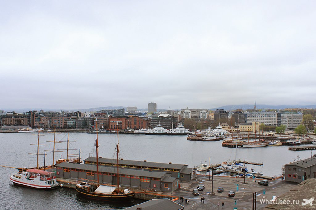Совсем рядом смотровая площадка, откуда открывается вид на не особенно красивую береговую линию Осло — застройки и порт.