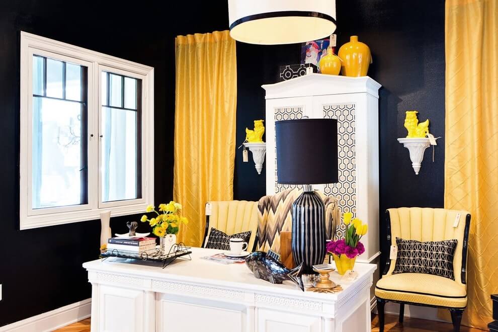 Цвет поярче, получистей применяют фрагментарно, для привлечения внимания к тому или иному месту. Это может быть либо уголок для общения, состоящий из желтого диванчика и пары пуфиков, либо часть стены, на которой демонстрируются черно-белые фото, полка с антикварной вазой и другие акцентные элементы интерьера.