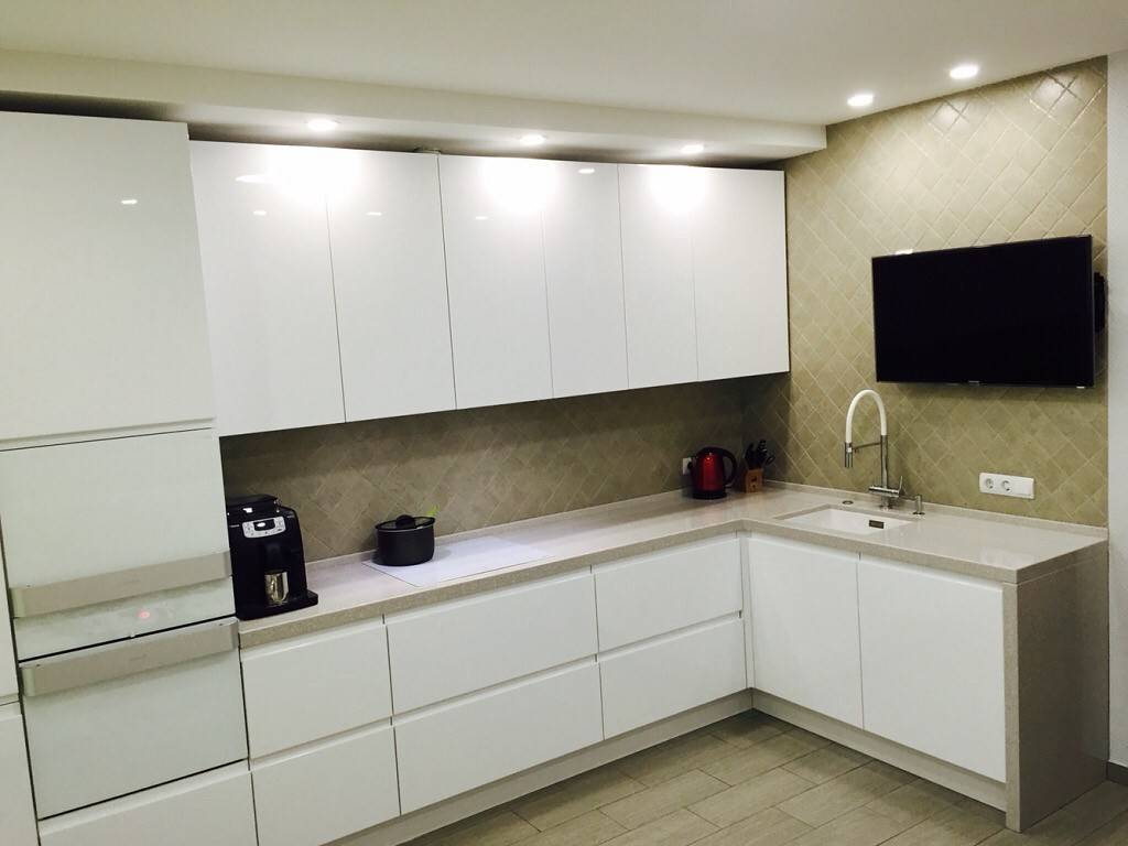 Не только важно определиться с цветом, но и решить, какой именно стиль будет гармонировать для глянцевой кухни. Поскольку фасад уже и так сияющий, то важно не допустить переизбытка данного сияния. В связи с этим недопустимо делать натяжной потолок, укладывать на пол или стены гладкую керамическую плитку