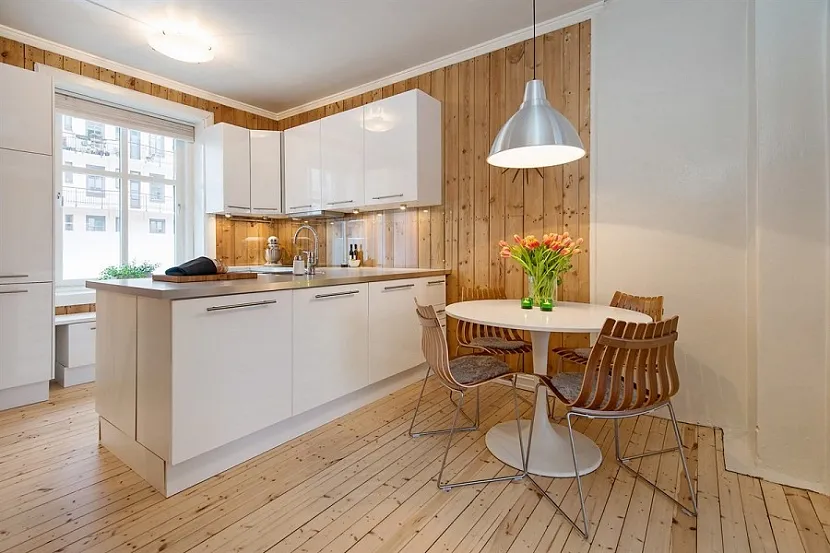 Дерево на стенах и потолке кухни выглядит очень красиво и органично. Вагонку можно использовать для полной отделки всех стен или только для стены и пола обеденной зоны. Неплохой вариант – кухонный фартук из дерева, но его предварительно нужно обработать антисептическими средствами и влагостойкими красками.