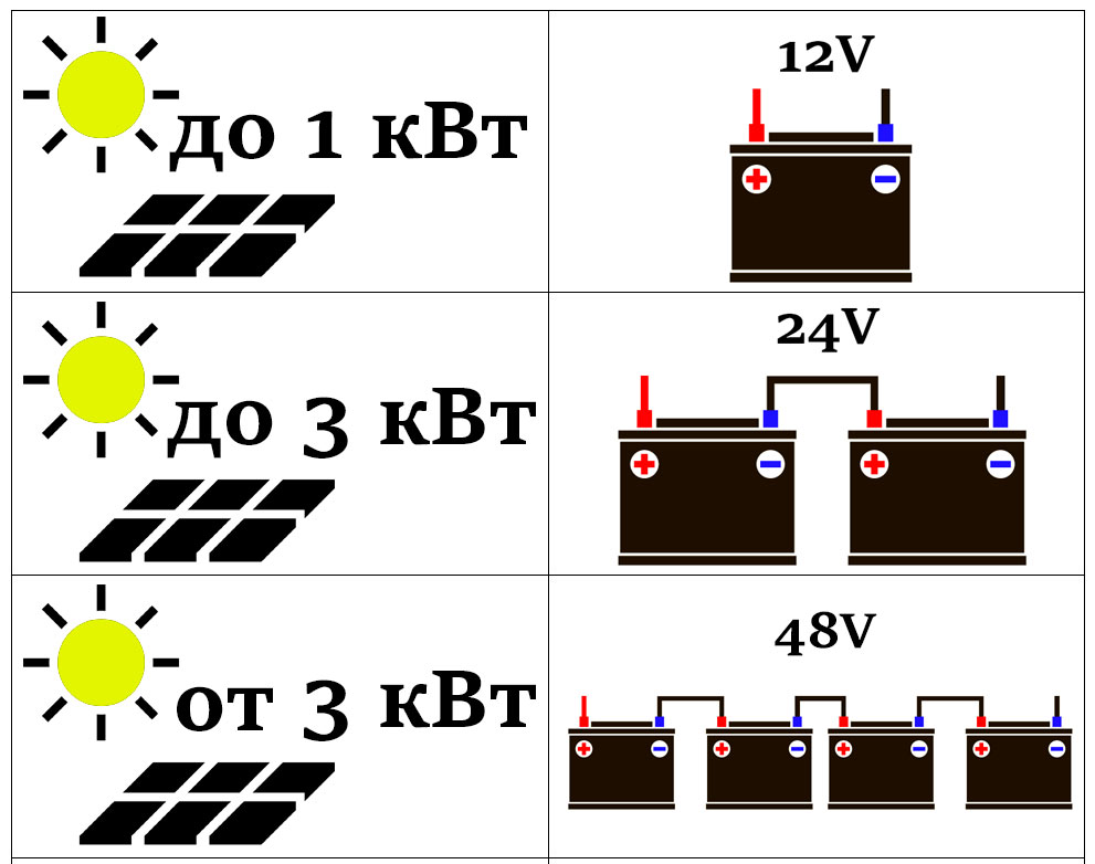 Чтобы вы понимали, когда говорят о системе 12V или 24V-48V, речь идет в первую очередь не о напряжении самих панелей, а о схеме подключения сборок АКБ.