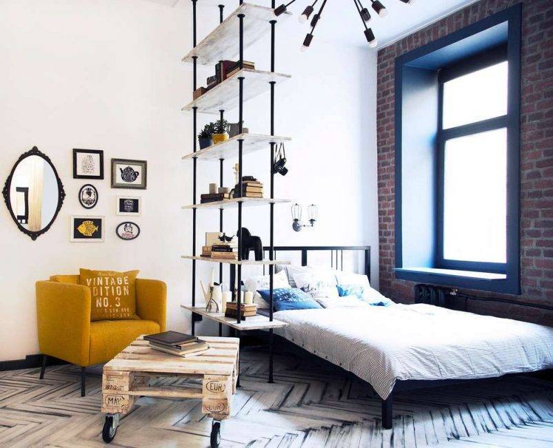 Обстановка в кухне-гостиной или спальне-гостиной в стиле лофт чаще всего разделяется посредством оформления мебельных островков, выделяющих определенную функциональную зону