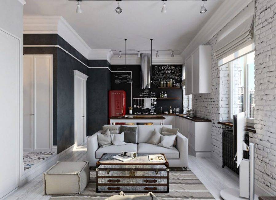 Гостиные в стиле лофт белого цвета выглядят просторно, стильно и броско